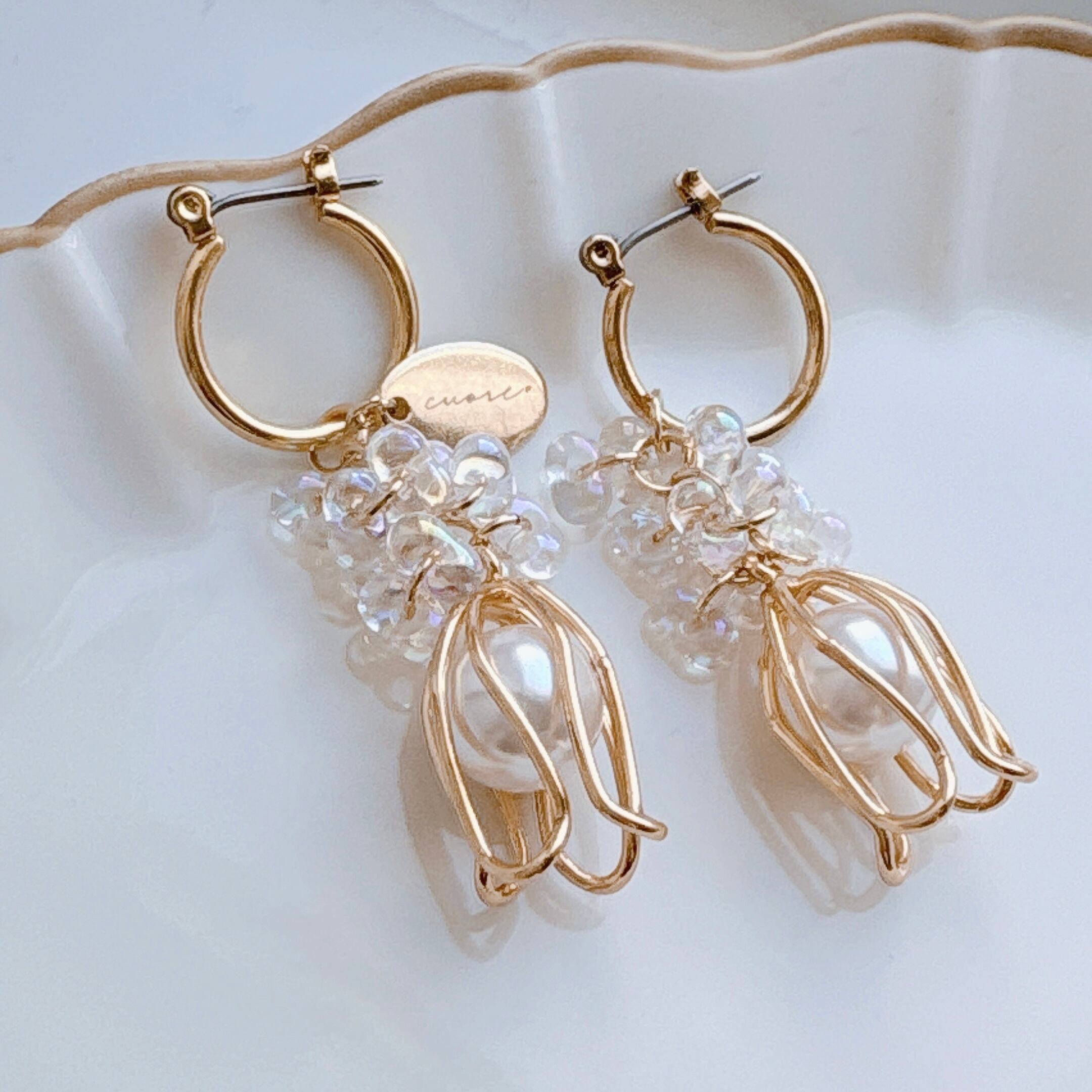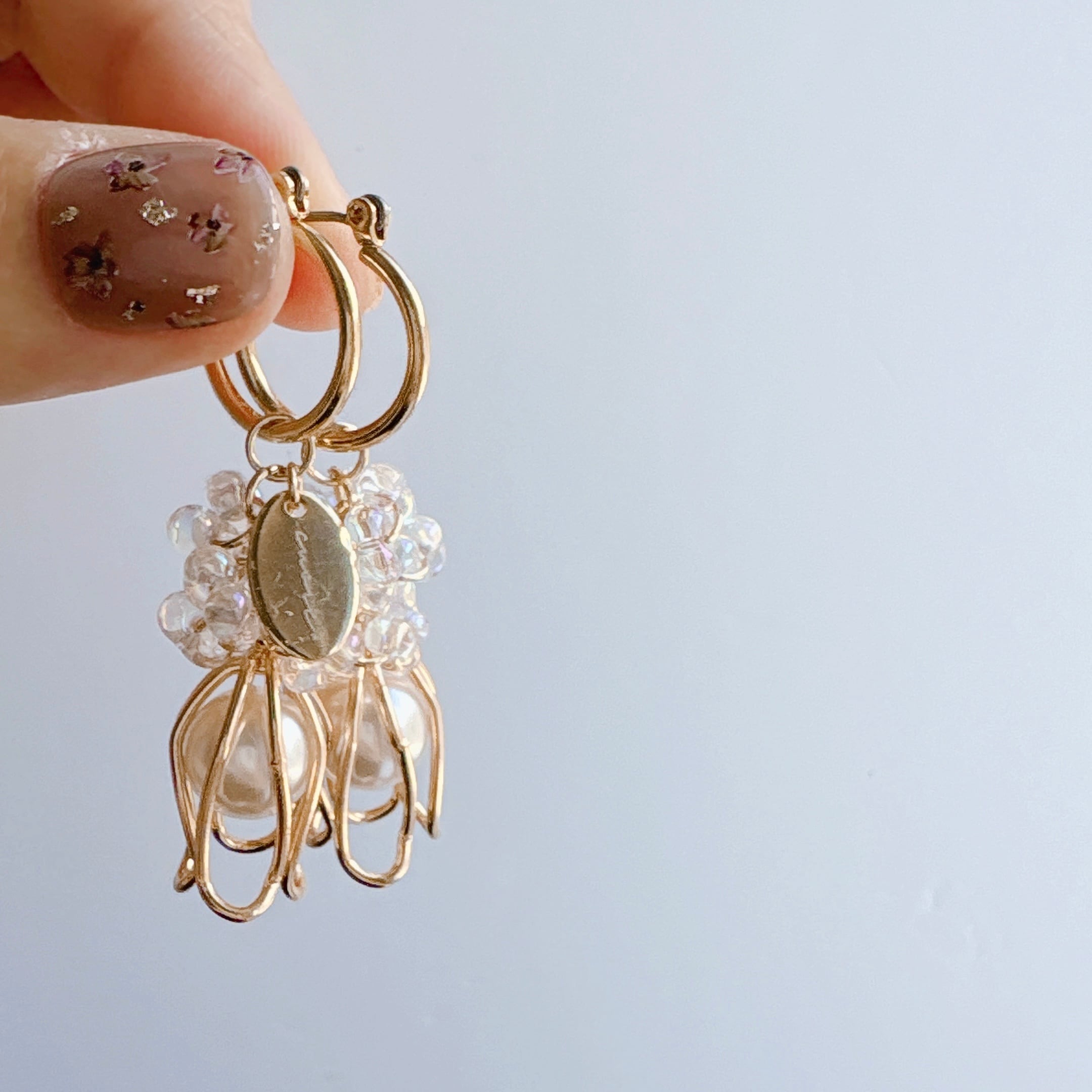 ワイヤーフラワーチャームにオーロラビーズを合わせたピアスです。