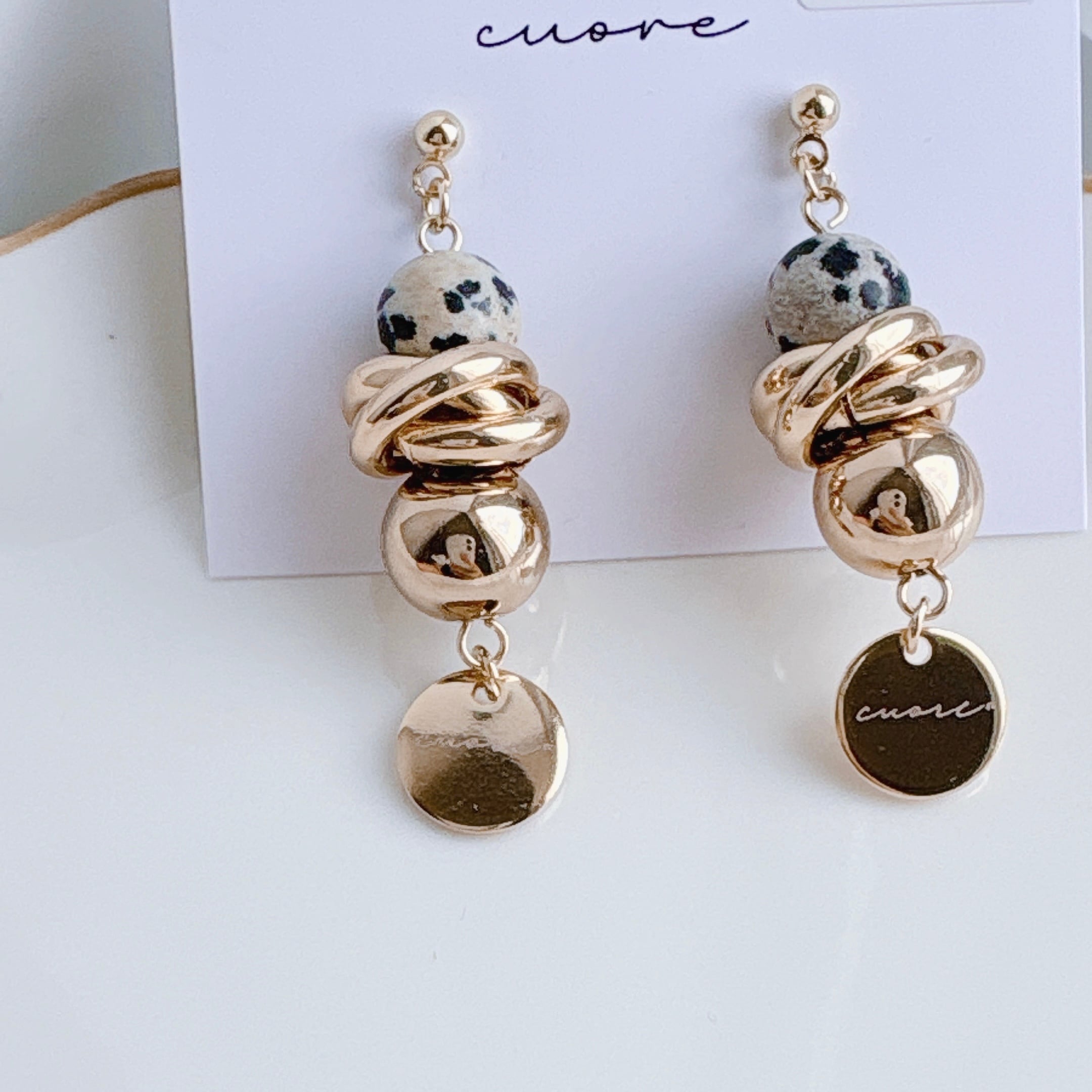 天然石ダルメシアンジャスパーにゴールドリングやゴールドビーズを合わせたピアスです。