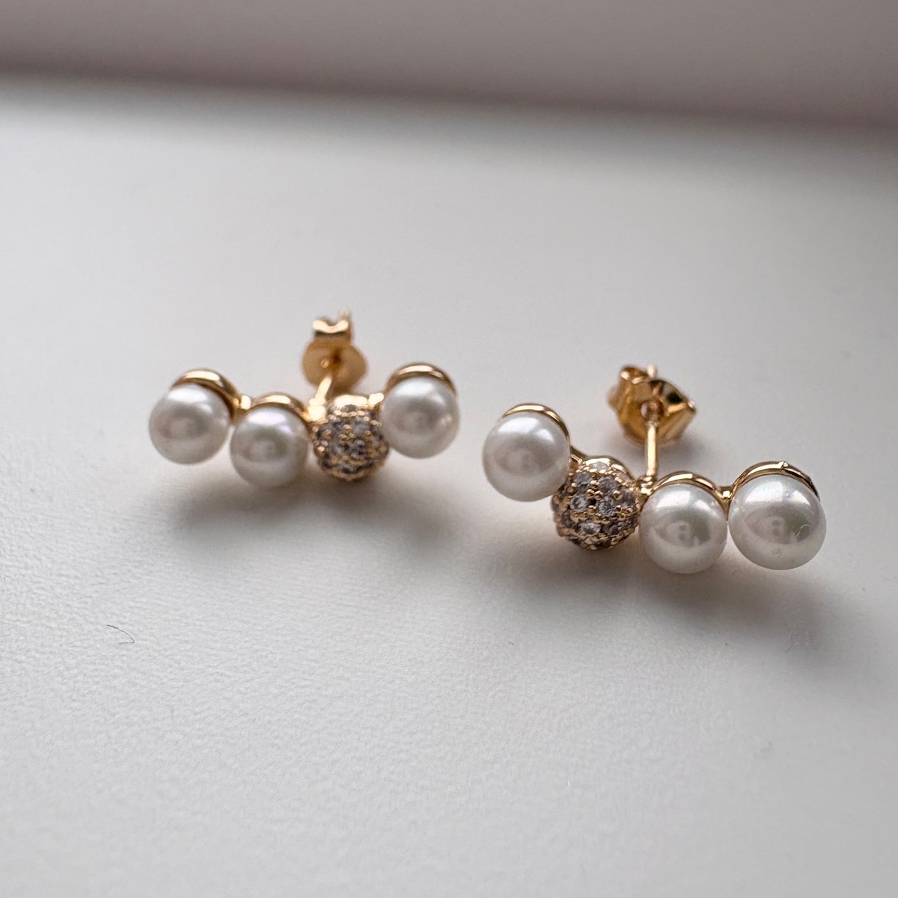 パールの中にパヴェボールがワンポイントとなっている小ぶりピアスです。