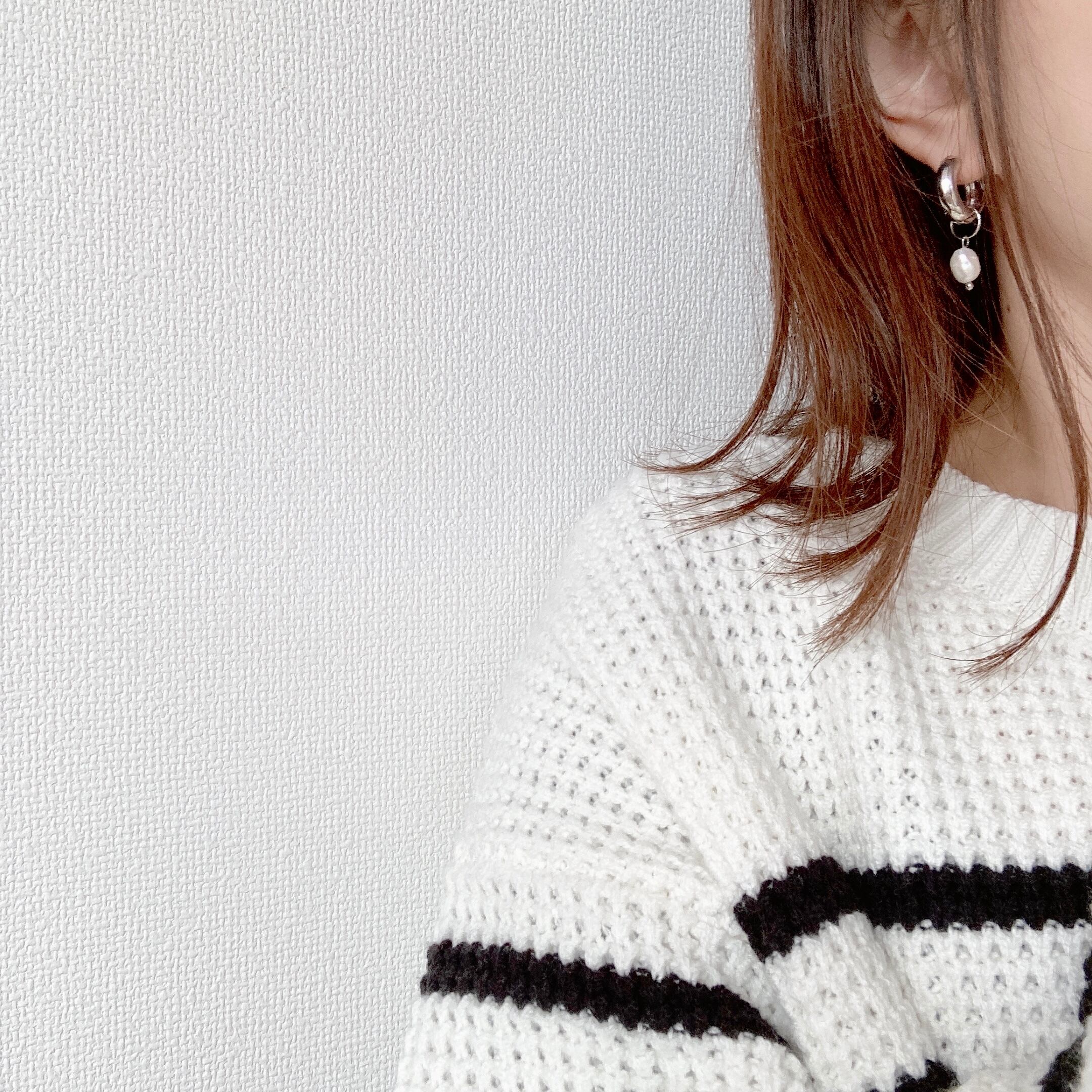 ゴールド/シルバーのシンプルなデザインのフープピアスに淡水パールを合わせました。