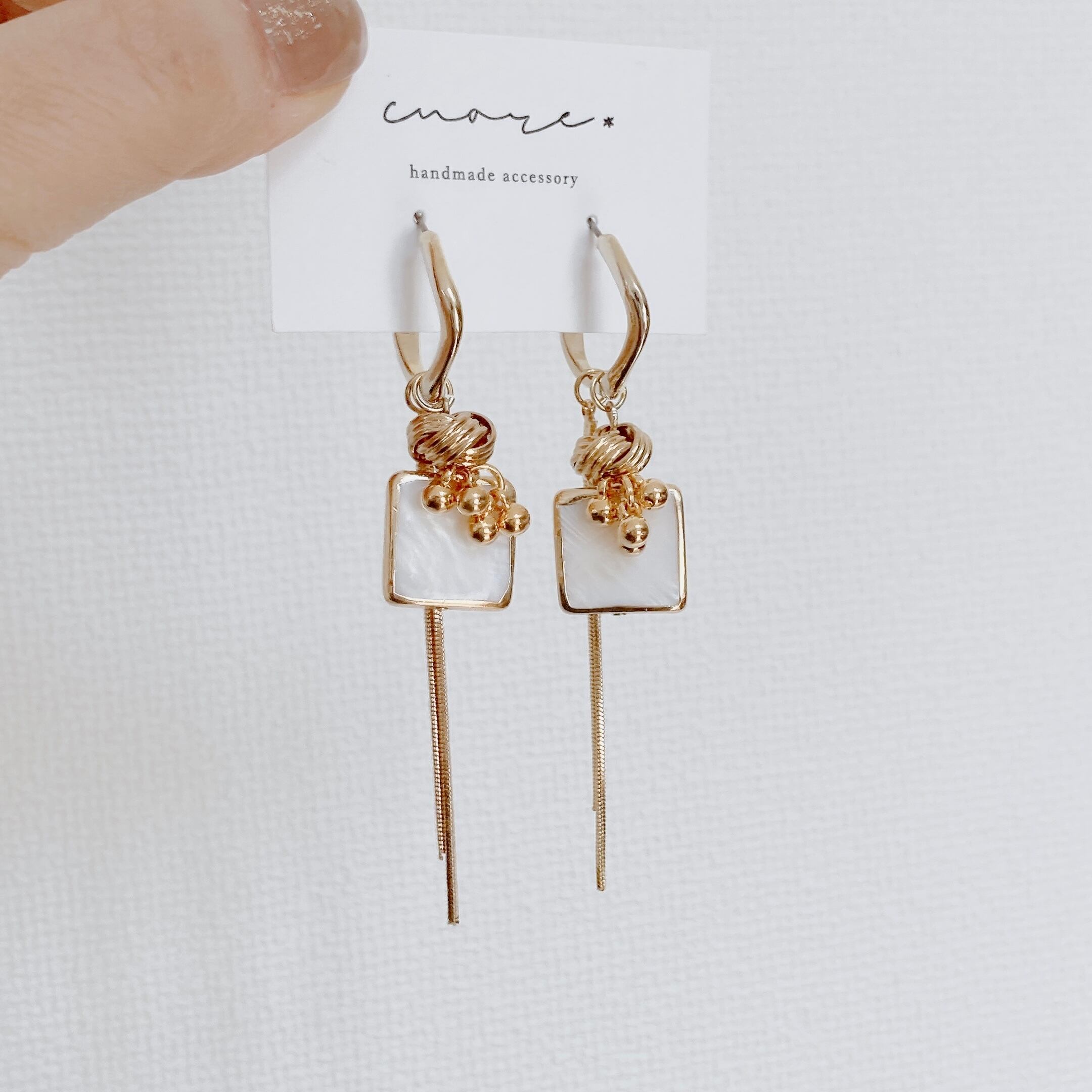 スクエアのホワイトシェルにゴールドビーズやチェーンを合わせたピアスです。