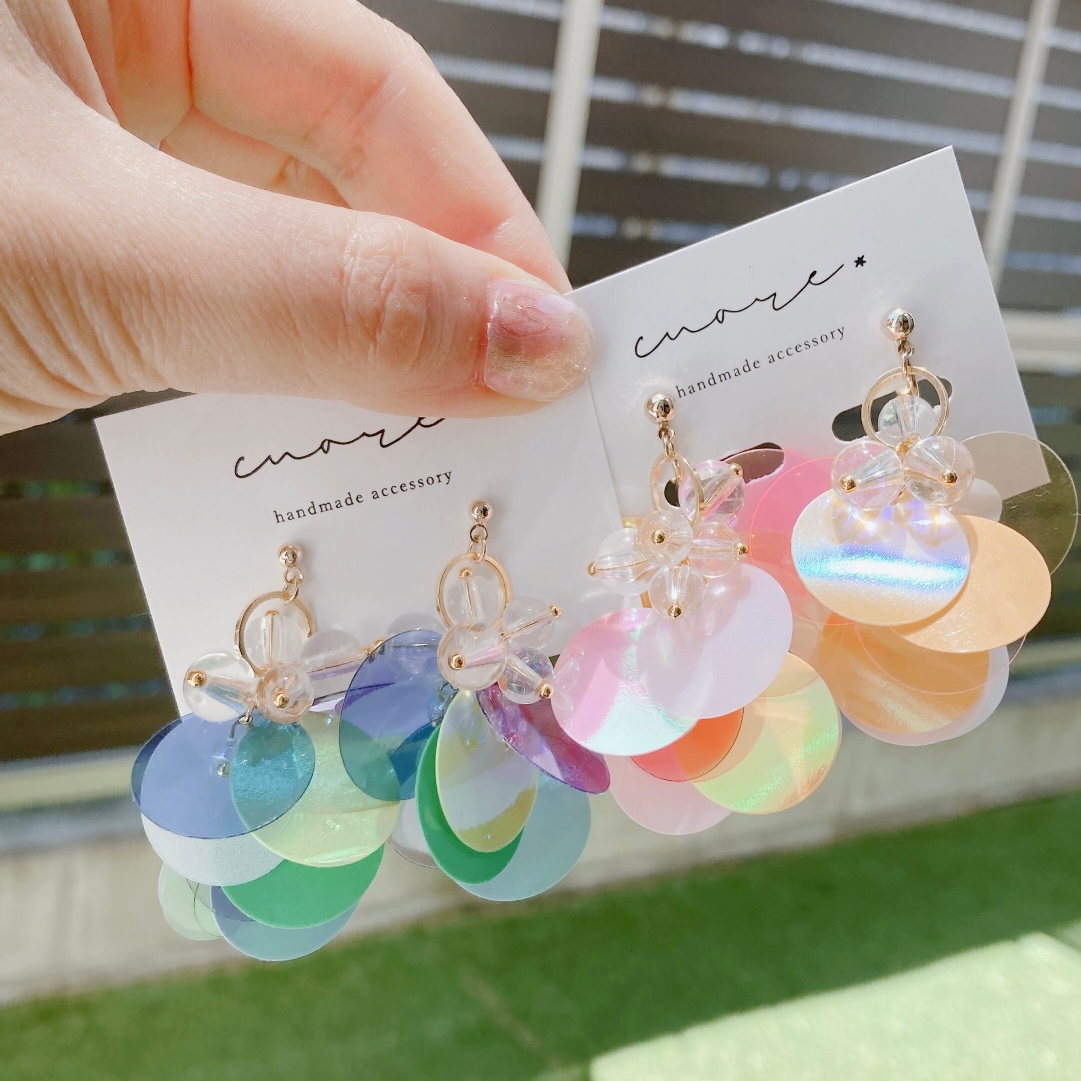 カラフルな大ぶりスパンコールとクリアビーズが可愛いピアスです。